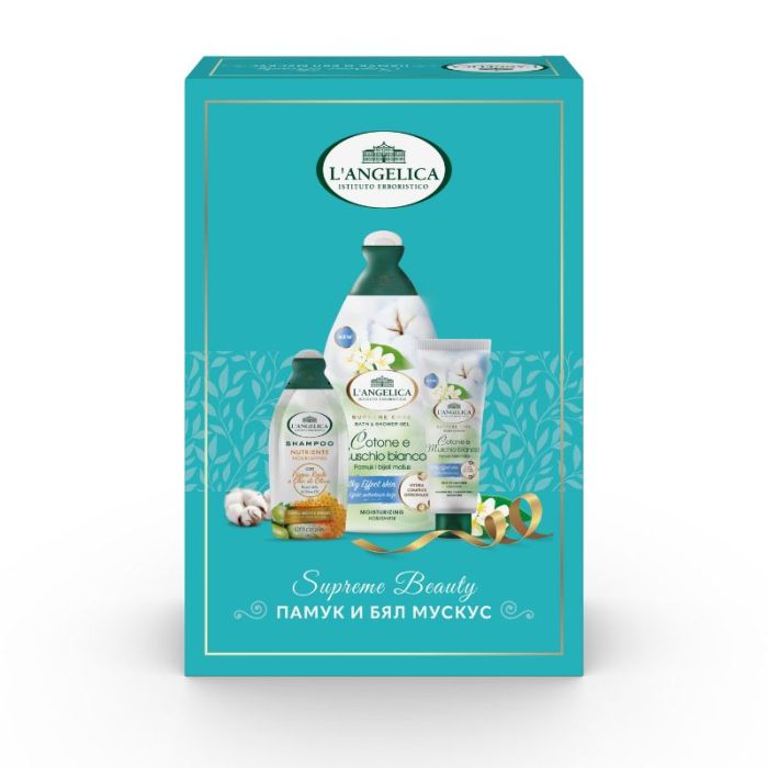 L'ANGELICA SUPREME BEAUTY ПАМУК И БЯЛ МУСКУС включва L'ANGELICA OFFICINALIS ДУШ-ГЕЛ ПАМУК И БЯЛ МУСКУС 500 мл, L'ANGELICA БОДИ ЛОСИОН С БИО ЕКСТРАКТ ПАМУК И БЯЛ МУСКУС 300мл и L'ANGELICA OFFICINALIS ШАМПОАН ПОДХРАНВАЩ С ПЧЕЛНО МЛЕЧИЦЕ И МАСЛО ОТ МАСЛИНА 10 мл.