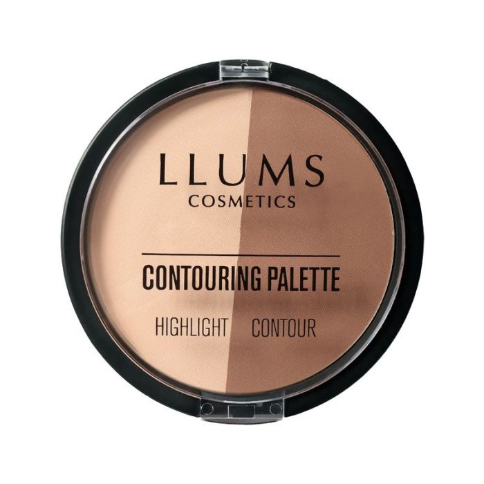 LLUMS палитра за контуриране с два нюанса за изпъкване и подчертаване чертите на лицето. На гърба се намира и упътване залесно контуриране в зависимост от облика на лицето .