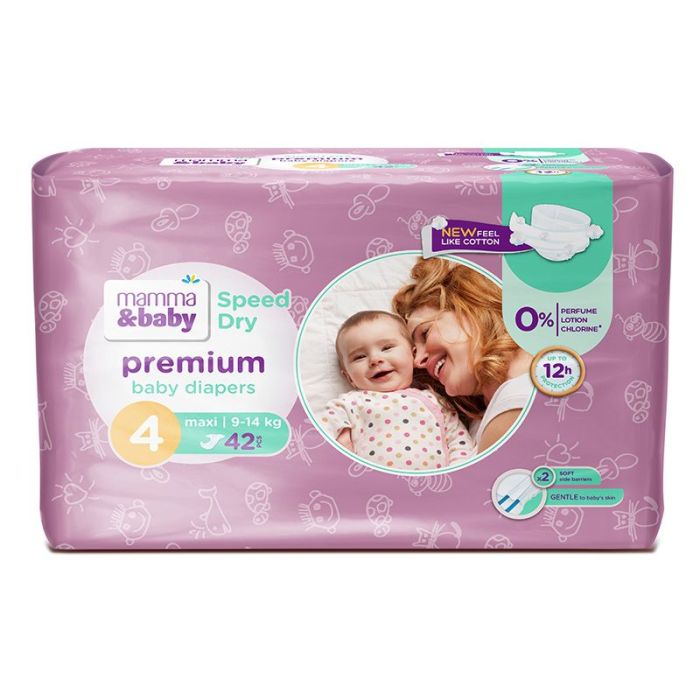 Пелени Mamma&baby предназначени за бебета с тегло 11-16 кг. 0% парфюм, лосион, *хлор. Обогатени вътрешни и външни слоеве, меки като памук. Двойните презрамки около крачетата осигуряват допълнителна защита срещу изтичане на течности, а пелената, според характеристиките и тънкостта си, позволява на бебето да се движи свободно.