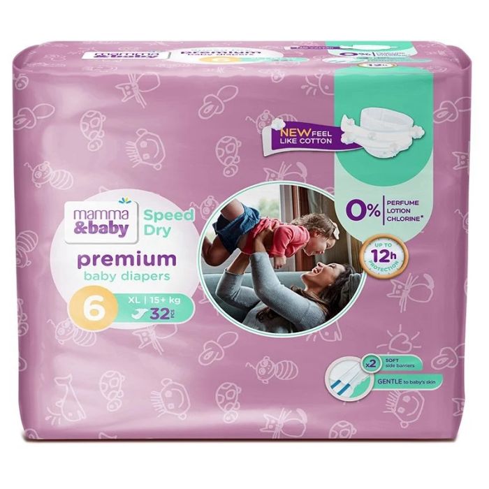 Пелени Mamma&baby предназначени за бебета 15+ кг. 0% парфюм, лосион, *хлор. Обогатени вътрешни и външни слоеве, меки като памук. Двойните презрамки около крачетата осигуряват допълнителна защита срещу изтичане на течности, а пелената, според характеристиките и тънкостта си, позволява на бебето да се движи свободно.