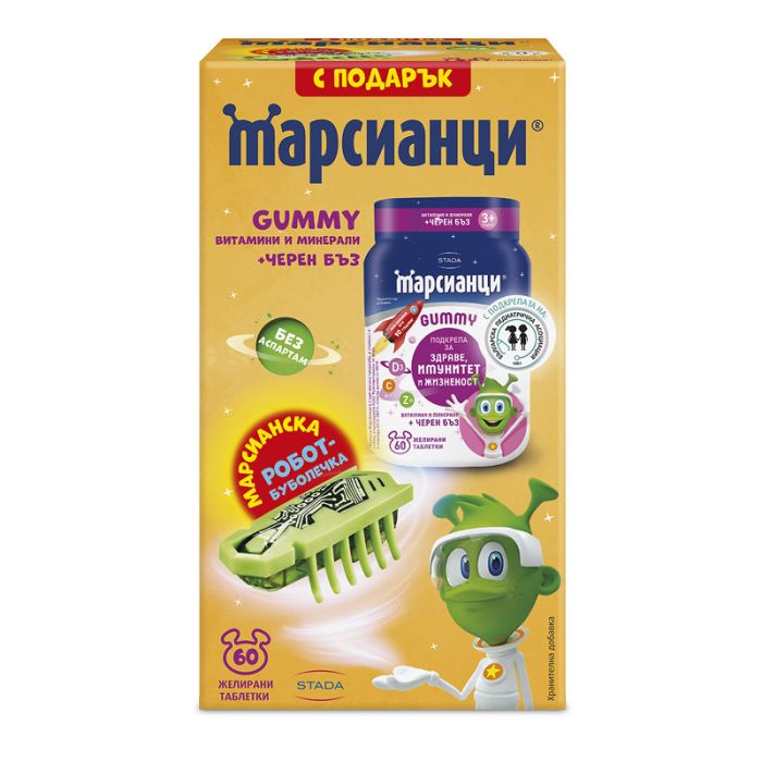 МАРСИАНЦИ GUMMY Детски желирани таблетки с черен бъз, 60 бр. + ПОДАРЪК Марсианска робот буболечка