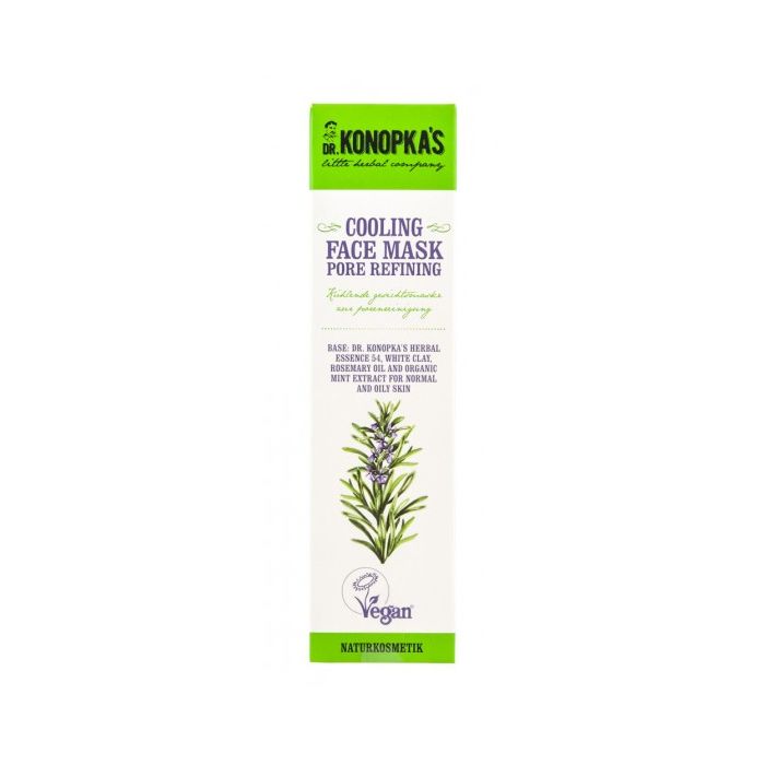 Натурална охлаждаща маска за лице за нормална и мазна кожа. Съдържа органичната билкова есенция №54 на Dr. Konopka за овлажняване на кожата в дълбочина и бяла глина за почистване на запушените пори, подхранване и овлажняване на кожата. Маслото от розмарин и екстрактът от мента охлаждат кожата, тонизират я и я правят еластична.