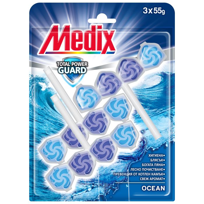 MEDIX WC TOTAL POWER GUARD – твърдо тоалетно блокче за хигиенична чистота и свеж дълготраен аромат на лавандула. Мощната формула осигурява • хигиена • богата пяна • блясък • лесно почистване • превенция от натрупване на котлен камък • свеж дълготраен аромат. С TOTAL POWER GUARD почистването е по-лесно, а тоалетната е блестяща и приятно ароматизирана. За по-добър ефект на защита срещу отлагания, използвайте тоалетното блокче заедно с MEDIX WC GEL TOTAL POWER GUARD