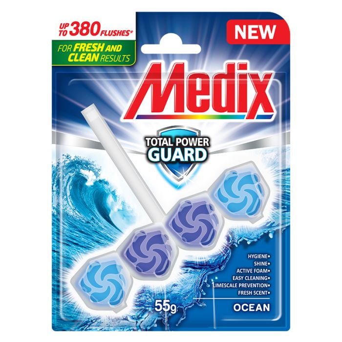 MEDIX WC TOTAL POWER GUARD ОКЕАН осигурява плътна пяна и блясък на тоалетната чиния, предотвратява натрупването на котлен камък и има продължителен ароматизиращ ефект.
