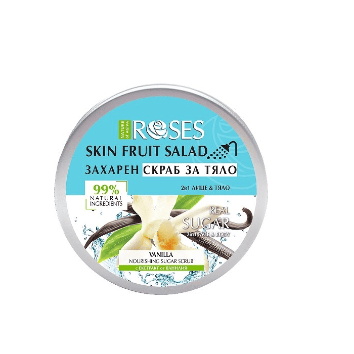 Натурален скраб с естествени захарни кристали, който осигурява тройно действие върху кожата – почиства, овлажнява и омекотява. Нежно ексфолира и премахва мъртвите клетки. Храна за сетивата и кожата със завладяващ аромат на ванилия, истинска захар и 100% естествени ексфолиращи частици. Съдържа натурални масла за копринено гладка, мека и подхранена кожа. Един продукт с две употреби: 1. За ежедневно измиване – нанесете върху влажна кожа, масажирайте леко и изплакнете; 2. Ексфолиант с подхранващи масла – за да премахнете мъртвите клетки нанесете върху влажна кожа, масажирайте интензивно с кръгови движения, изплакнете.