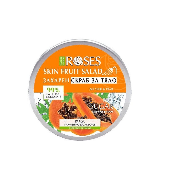 Натурален скраб с естествени захарни кристали, който осигурява тройно действие върху кожата – почиства, овлажнява и омекотява. Нежно ексфолира и премахва мъртвите клетки. Храна за сетивата и кожата със завладяващ аромат на папая, истинска захар и 100% естествени ексфолиращи частици. Съдържа натурални масла за копринено гладка, мека и подхранена кожа. Един продукт с две употреби: 1. За ежедневно измиване – нанесете върху влажна кожа, масажирайте леко и изплакнете; 2. Ексфолиант с подхранващи масла – за да премахнете мъртвите клетки нанесете върху влажна кожа, масажирайте интензивно с кръгови движения, изплакнете.