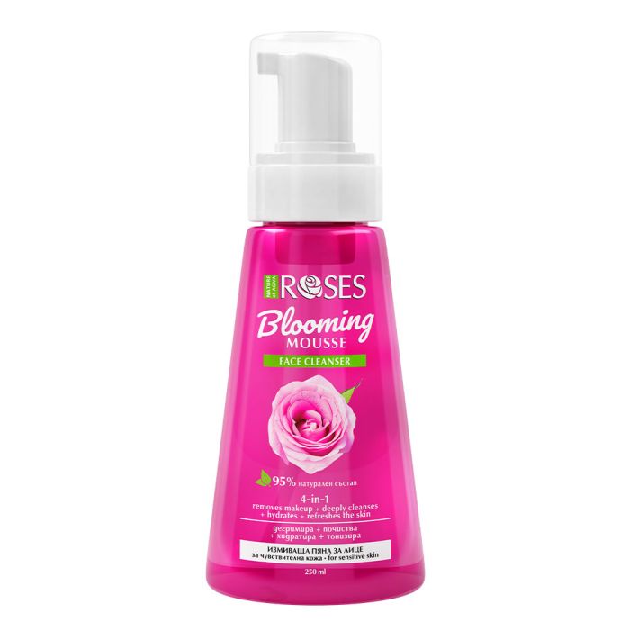 BLOOMING FACE FOAM - 4в1 Разкрасяваща пяна за лице с натурална розова вода. Един продукт с 4 действия: 1.Дегримира 2.Дълбоко почиства 3.Хидратира 4.Тонизира. Нежен към чувствителната кожа на лицето, не дразни очите. Активните мицели улавят всички остатъци от грим и замърсявания, почистват дори и водоустойчив грим. Натуралната розова вода хидратира и успокоява кожата. Подходящ за ежедневна употреба.