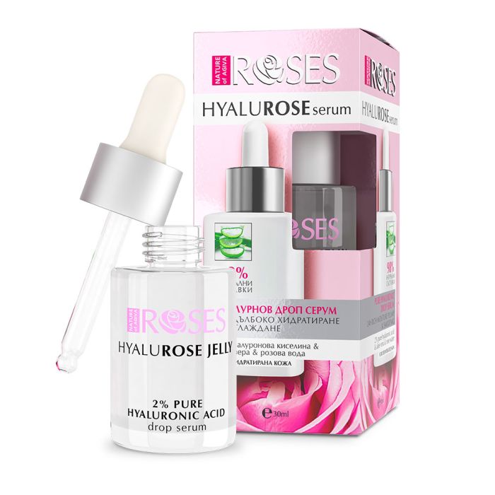 HYALUROSE дроп серум за 24 часа интензивна хидратация с 98% натурални съставки. Формула, осигуряваща 24 часа интензивна хидратация на основата на чист алое гел, обогатена с 2% хиалуронова киселина и розова вода, без силикони, синтетични оцветители и парабени. Естествена за организма, концентрацията на два типа хиалуронова киселина се абсорбира лесно и бързо в дълбоките слоеве на дермата. В комбинация с розовата вода гарантира свеж вид и интензивна хидратация, и спомага за намаляване на появата на фини линии и бръчки. Добавените алое вера и розова вода освежават и регенерира кожата в дълбочина. Подходящ за всеки тип кожа.