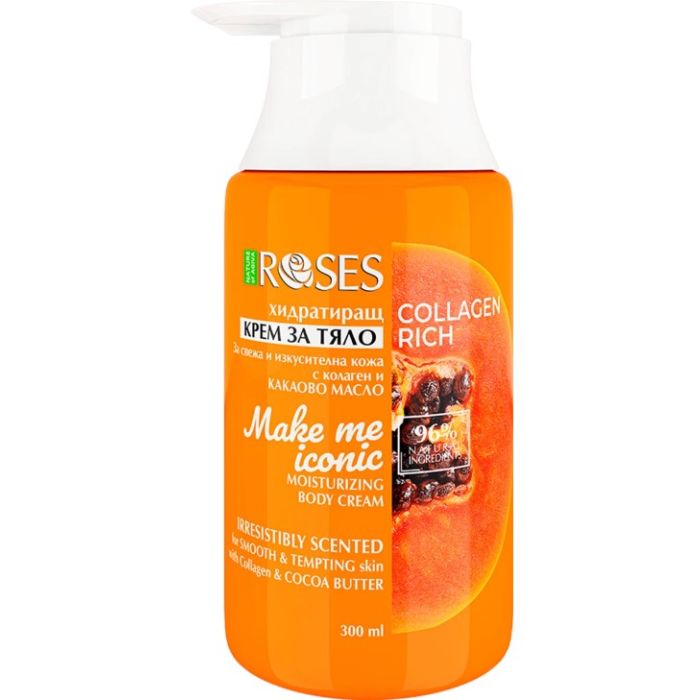 COLLAGEN RICH боди крем с колаген и какаово масло за свежа и гладка кожа. Дълбоко овлажняваща грижа с натурална розова вода и 96% натурални съставки, която възстановява еластичността на кожата, подсилва съединителната тъкан, стяга и подобрява контура, придавайки и свеж и сияен вид. С неустоим аромат на сочна папая и удобна помпа дозатор за лесна употреба.