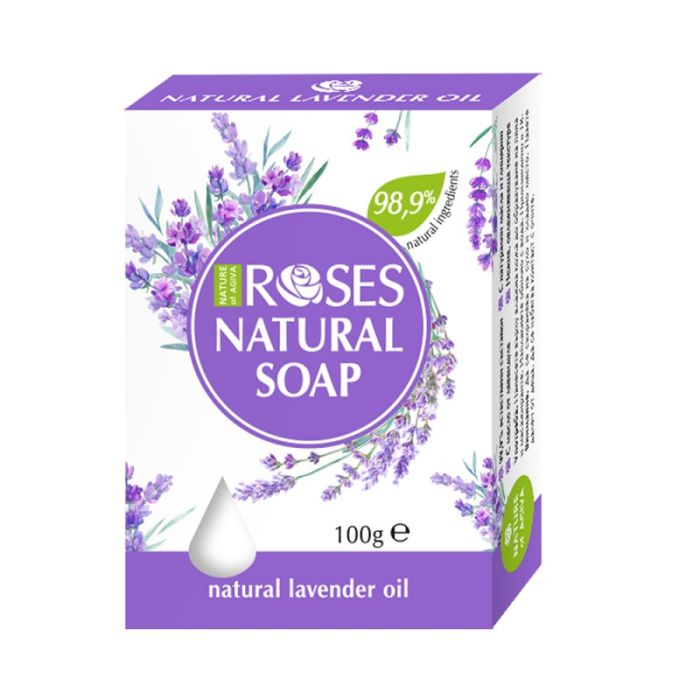 Натурален сапун Nature of Agiva ROSES, обогатен с масло от лавандула. Студено пресован, богат на растителни масла и глицерин, за допълнителна хидратация и копринено гладка кожа. Храна за сетивата и баланс на емоциите, с нежен аромат на лавандула.