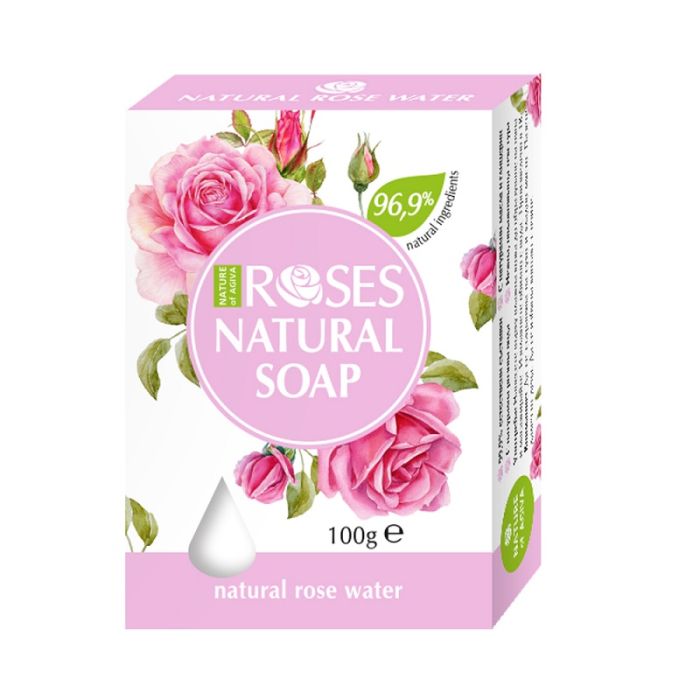 Натурален сапун Nature of Agiva ROSES, обогатен с розова вода. Студено пресован, богат на растителни масла и глицерин, за допълнителна хидратация и копринено гладка кожа. Храна за сетивата и баланс на емоциите, с пленителен аромат на роза.