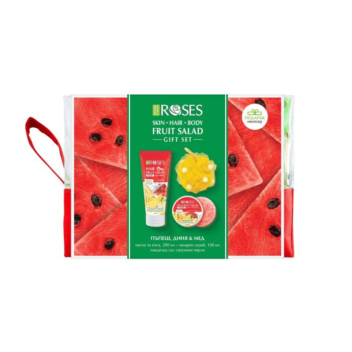 Ароматна панделка със сапунени перли ROSES “BODY FRUIT SALAD” 100% ПЛОДОВА САЛАТА ЗА ЖАДНА КОЖА с аромат на диня, пъпеш и мед. Вградените ароматни перлички от сапун образуват богата и нежна почистваща пяна. Храна за сетивата и кожата със 100% завладяващи плодови аромати.