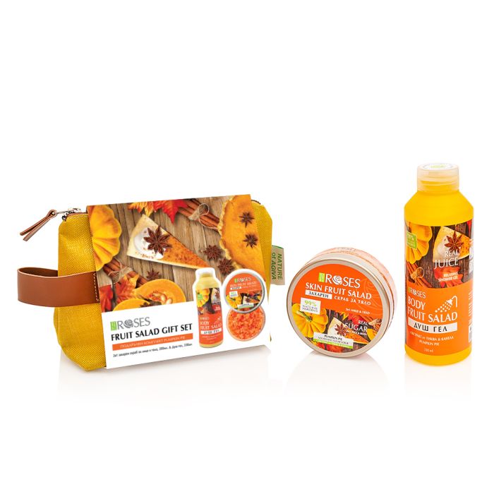 BODY FRUIT SALAD Хидратиращ натурален душ гел - PUMPKIN PIE. Деликатно измиваща формула с 91% съставки от натурален произход. Съдържа екстракт от тиква и канела, които подхранват кожата с витамини и неутрализират стреса. Богата овлажняваща грижа и храна за сетивата с пленителен аромат на тиквен пай и канела.