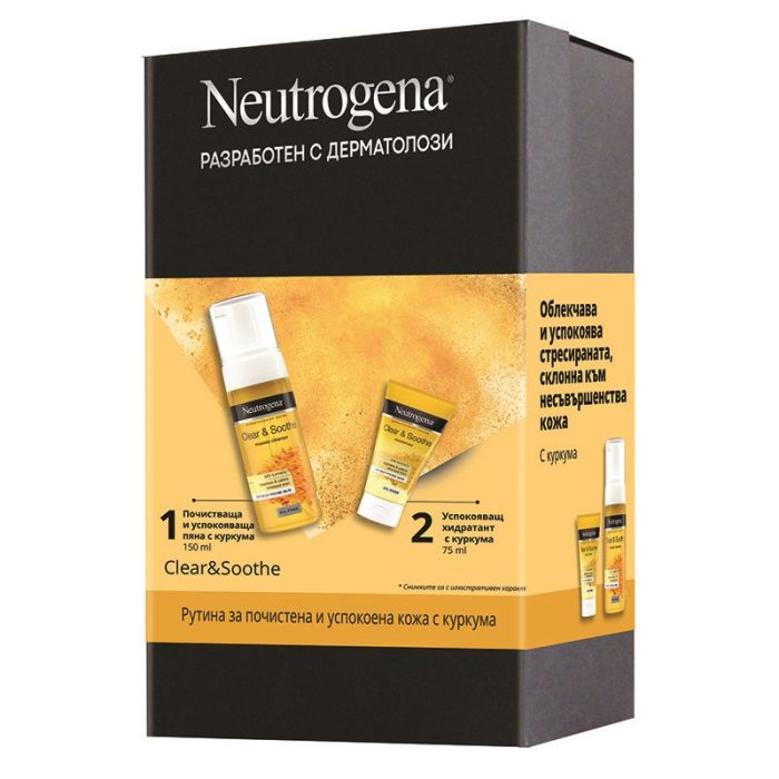 NEUTROGENA CLEAR & SOOTHE Комплект Почистваща и успокояваща пяна с куркума, 150 мл + Успокояващ хидратант с куркума, 75 мл
