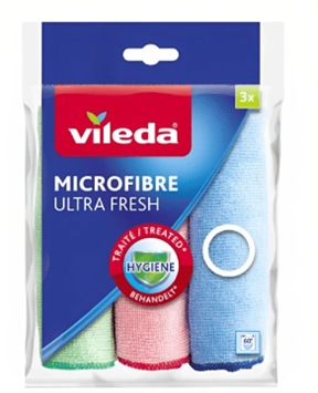 Универсалните кърпи ULTRA FRESH от 100% висококачествен микрофибър са силно абсорбиращи и премахват замърсяванията без следи, дори без почистващи препарати. Обработени са по метода ANTI-BAC*. Кърпите са с размери 30x30 см, изключително издръжливи и могат да се перат на максимум 60°C в пералня.