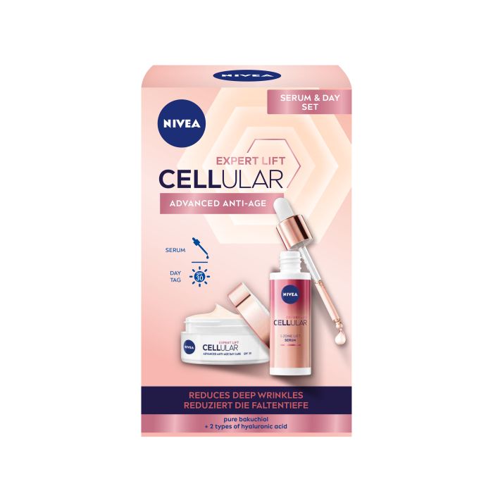 Събирайте погледите около себе си с чиста, млада и сияйна кожа с комплекта на Nivea Cellular Expert Lift, включващ дневен крем и серум за лице.