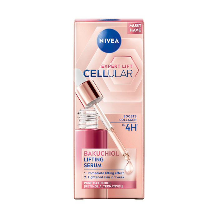Новият серум от NIVEA CELLULAR EXPERT LIFT действа в дълбочина на клетъчно ниво, за доказан ефект върху 3 зони: лицето, шията и деколтето. Подсилен с 10 пъти повече чист Bakuchiol – съставка, която доказано стимулира обновяването на клетките и ускорява производството на два вида колаген2.