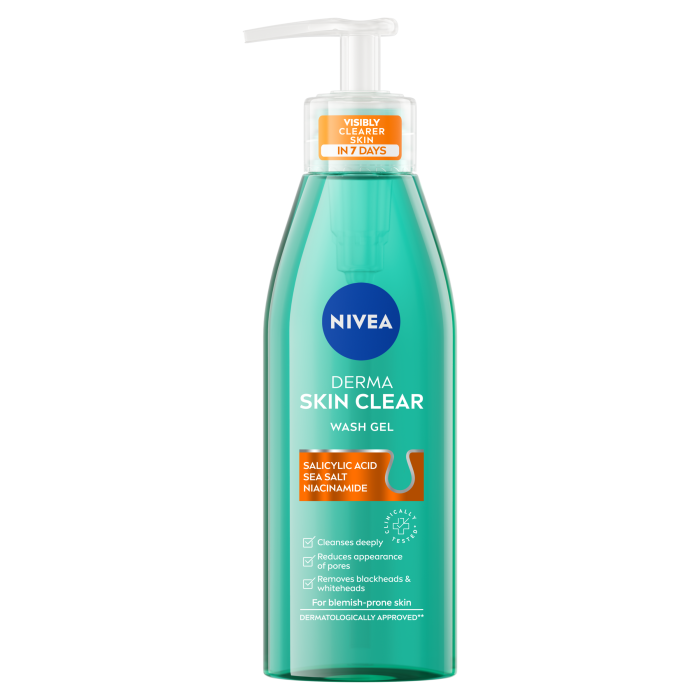 NIVEA DERMA SKIN CLEAR Измиващ гел за проблемна кожа е със Салицилова киселина и Niacinamidе, специално формулиран за проблемна, склонна към пъпки кожа. За кожа склонна към акне.