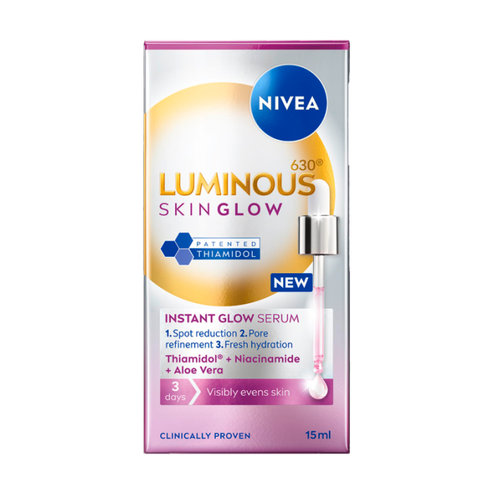 LUMINOUS630® SKIN GLOW Серум за мигновен блясък е първият серум на NIVEA, който се справя с многоизмерността на блясъка