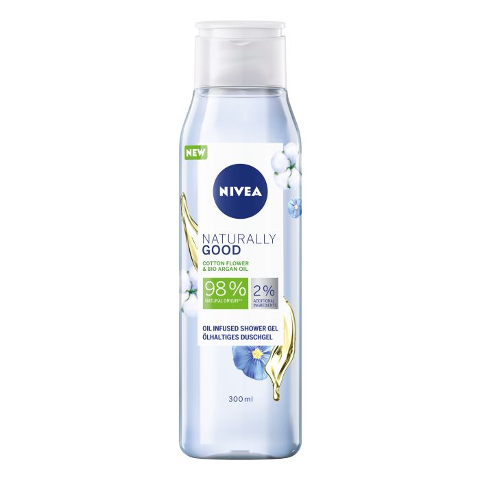 Душ гел NIVEA Naturally Good с аромат на памучен цвят е направен от 98% естествено добити съставки* и внимателно извлечено био арганово масло. SLES формула - не съдържа сулфати и аромати с алергени (съобразно регламент за козметични продукти на ЕС). Формула без пластмасови микрочастици - съобразно дефиниция на ООН. В баланс с естествения микробиом на кожата. Бутилка направена от 100% рециклирана PET пластмаса.