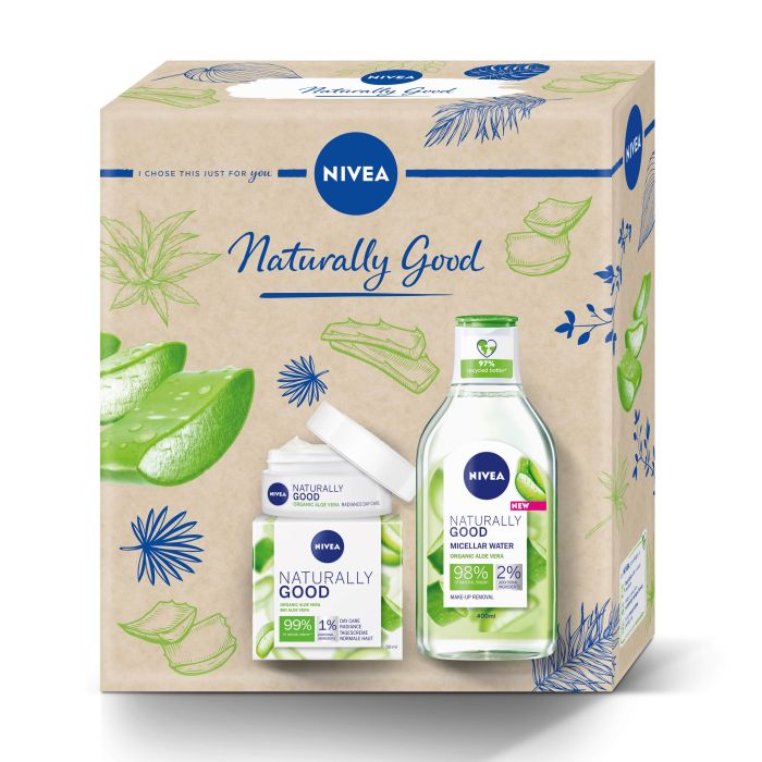 Пробвай новата мицеларна вода NIVEA Naturally Good с Био Алое Вера и 98% съставки от естествен произход за 100% прозрачна грижа за теб и твоята кожа. Освежаващата формула нежно, но ефективно почиства кожата и премахва грим и замърсявания. Мицеларната технология действа като магнит и привлича всички нечистотии, себум и грим, без да оставя следи. За перфектно чиста, свежа и хидратирана кожа, която диша свободно.