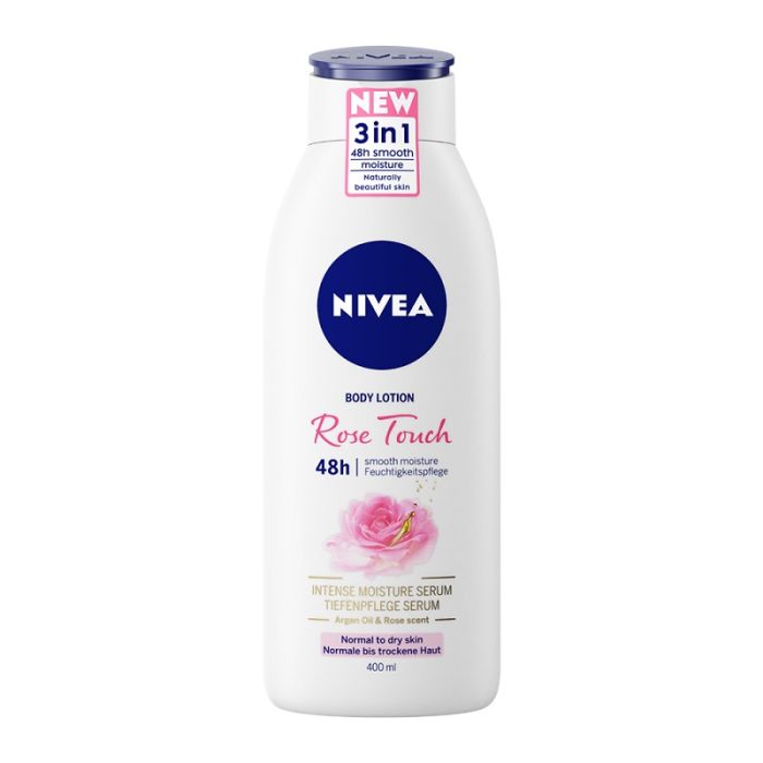 Nivea 48H Rose Touch Body Lotion е лосион за тяло, който хидратира кожата. Подходящ за всеки тип кожа. Специалната формула е обогатена с интензивен овлажняващ серум и арганово масло, които успокояват раздразненията и оставят кожата мека и с усещане за комфорт. Грижовната формула осигурява до 48 часа хидратация. Нивеа Роуз Тъч Хидратиращ лосион за тяло с аромат на роза има лека флуидна текстура, която се абсорбира бързо и предпазва кожата от изсушаване. Лосионът е подходящ за ежедневна грижа. Без парабени. Дерматологично тестван продукт.