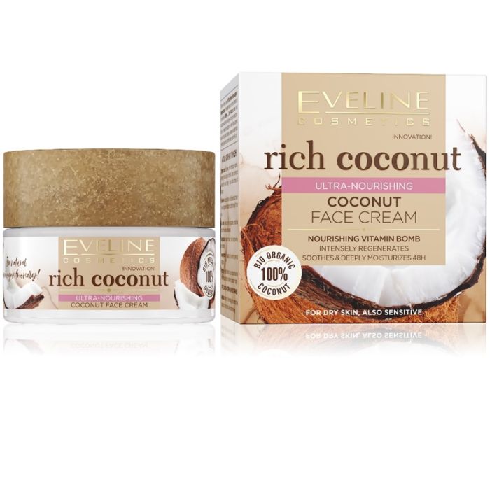 Eveline Rich Coconut Подхранващ крем за лице с био кокос за суха и чувствителна кожа, който видимо подобрява хидратацията на кожата и възстановява здравословния й вид. Възрастова група 25+; Тип кожа - Чувствителна, Суха; Предназначение - Подмладяване, Против бръчки, Подхранване; За жени и момичета. Нутриентите в състава осигуряват перфектна подхранваща грижа. 100% Органично кокосово олио, био алое вера и олио от сладък бадем, както и витамините А, С, Е и РР, овлажняват в дълбочина и стягат кожата.