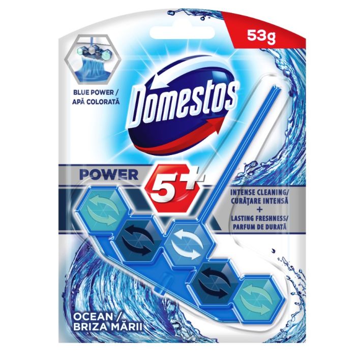 Придайте допълнителен заряд на всяко пускане на водата на тоалетната с Domestos Power 5: 1. Обилна пяна; 2. Предотвратява натрупването на варовик; 3. Дълготраен аромат; 4. Блясък; 5. Премахване на замърсяването. За максимален ефект поставете продукта там, където потока на водата е най-силен.