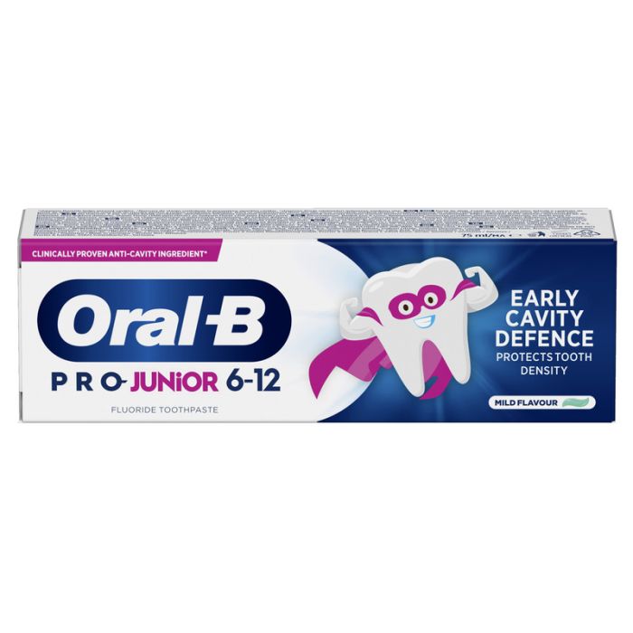 Oral-B Junior Toothpaste for kids 6-12 years 75 ml се грижи за почистването на нежните млечни зъби на децата, предпазва ги от бактерии и плака и от образуването на кариеси. Орал-Б Джуниър се отличава с гелообразна, лесна за употреба текстура и с приятен плодов вкус, любим на децата. Подходяща за употреба от деца над 6-годишна възраст.