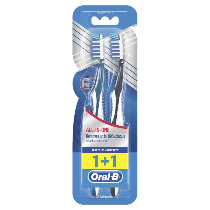 Четката за зъби Oral-B Pro-Expert All In One Toothbrush Pack of 2 премахва до 90 процента повече плака в сравнение с обикновена четка за зъби. Влакната Power Tip достигат до междузъбните пространства и най-труднодостъпните места. Четката Орал-Б Про-Експерт Ол ин Уан Четка за зъби 2 бр е щадяща към емайла и в същото време безпощадна към плаката и замърсяванията. Редовната й употреба с подходяща паста за зъби гарантира отлична орална хигиена. Препоръчително е четката да се сменя на всеки три месеца. В комплекта се съдържат две четки.