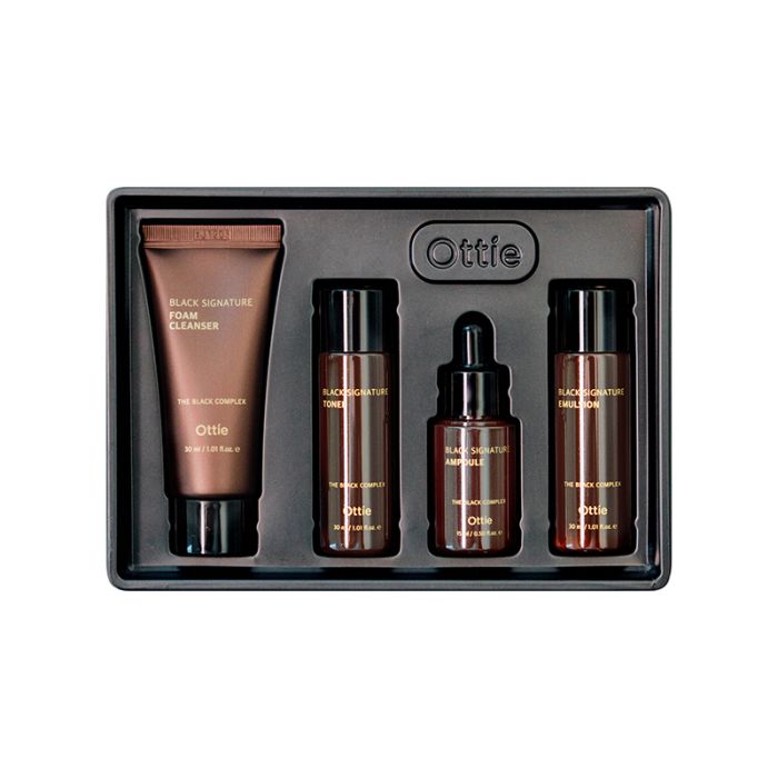 Ottie Black Signature Miniature Set се състои Тонер 30 мл., Емулсия 30 мл., Почистваща пяна 30 мл., Ампула 15 мл.