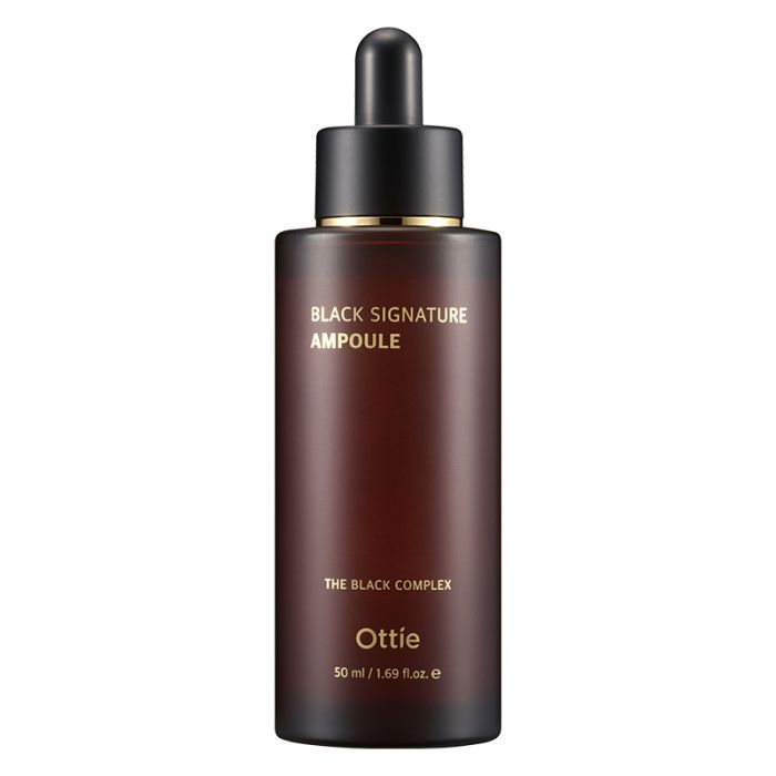 Силно концентрираната ампула Ottie Black Signature Ampoule, Ампула за лице, с формула с "черен комплекс", съдържаща Муцин от черен охлюв, екстракти от черен чай и черни перли, които помагат за намаляване на появата на бръчки, изглаждане на фините линии на лицето, както и за гладка текстура на кожата.