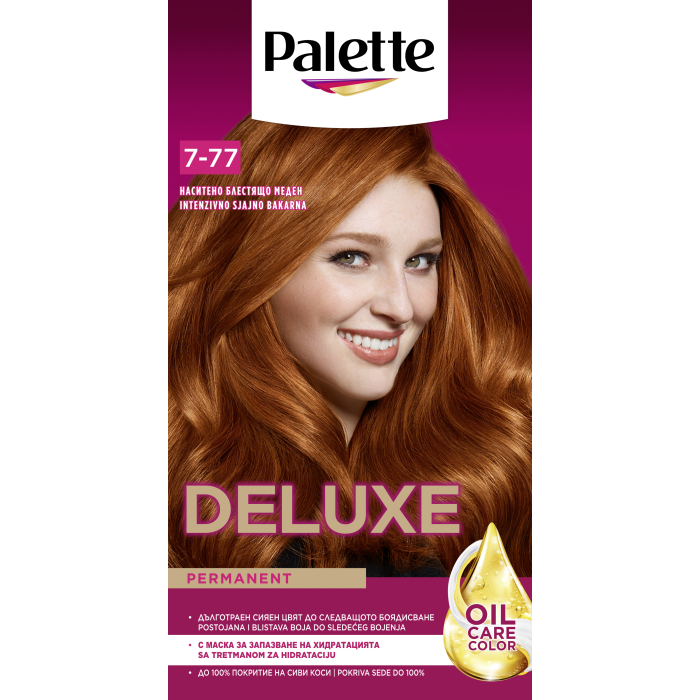 Боята за коса Schwarzkopf Palette Deluxe има висока концентрация на цветни пигменти, с което осигурява дълготраен резултат до 10 седмици. В комплекта има и грижовна маска с масло от марула, което има благоприятно действие върху косата- заглажда повърхността на фибрите на косъма и ? придава сензационен блясък. Формулата на Schwarzkopf Palette Deluxe осигурява безупречни резултати от корените до върховете и успешно покрива белите коси.