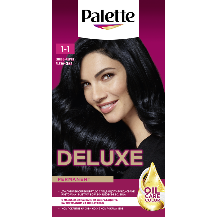 Боята за коса Schwarzkopf Palette Deluxe има висока концентрация на цветни пигменти, с което осигурява дълготраен резултат до 10 седмици. В комплекта има и грижовна маска с масло от марула, което има благоприятно действие върху косата- заглажда повърхността на фибрите на косъма и придава сензационен блясък. Формулата на Schwarzkopf Palette Deluxe осигурява безупречни резултати от корените до върховете и успешно покрива белите коси.