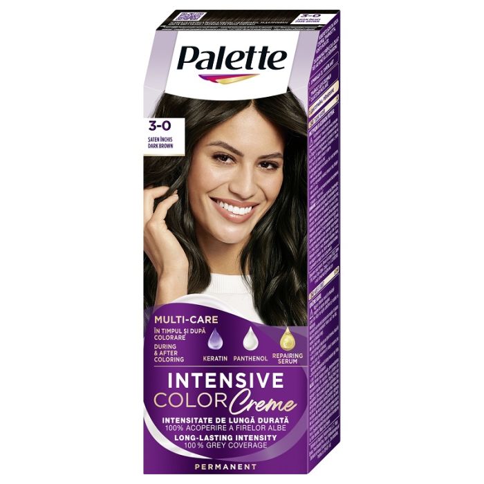 Боята за коса Palette Intensive Color Creme придава на косата дълготраен цвят в продължение на седмици с помощта на интензивните пигменти, които проникват дълбоко в косъма и го защитават от избледняване. Формулата обогатена с кератин, пантелнол и подхранващи масла се грижи за косата като я подсилва и омекотява. Покрива побелелите коси и запечатва косъма за красив дълготраен цвят.