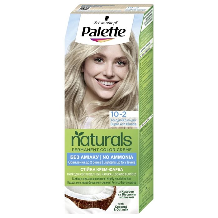 Боя за коса Palette naturals - крем-боя без амоняк с кокос, който подхранва косата и е подбран специално за изрусени коси. Цветните пигменти придават естествен вид и жизнено рус цвят. Можете да постигнете до 2 нива на изсветляване. Комплектът за боядисване съдържа и нежен балсам с овесени ядки, който ще подхрани косата и ще я остави копринено мека и сияйна.