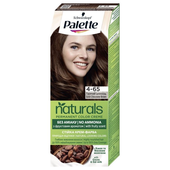 Боя за коса Palette naturals - крем-боя без амоняк с какао, което подхранва косата и е подбрано специално за брюнетки. Цветните пигменти придават естествен вид и наситен цвят. В резултат получавате до 100% покритие на сивите коси. Комплектът за боядисване съдържа и нежен балсам с овесени ядки, който ще подхрани косата и ще я остави копринено мека и сияйна.