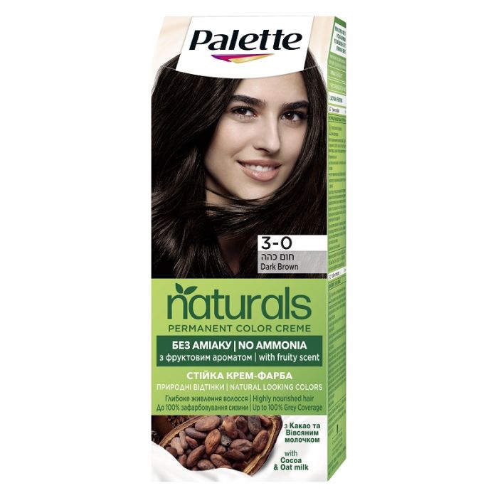 Боя за коса Palette naturals - крем-боя без амоняк с какао, което подхранва косата и е подбрано специално за брюнетки. Цветните пигменти придават естествен вид и наситен цвят. В резултат получавате до 100% покритие на сивите коси. Комплектът за боядисване съдържа и нежен балсам с овесени ядки, който ще подхрани косата и ще я остави копринено мека и сияйна.