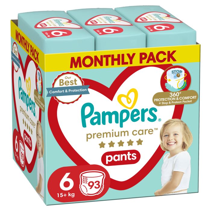 Подарете на Вашето бебе комфорт и защита от Pampers с гащичките Pampers Premium Care Pants! Сега с революционен джоб Stop & Protect, който помага за предотвратяване на протичанията откъм гърба, за пълна защита от протичане до 12 часа. Тъй като Вашето бебе става по-активно, ще имате нужда от пелена, която осигурява удобно прилягане и сигурна защита, така че бебето да може да се справи с всяко движение. Ето защо гащичките Pampers Premium Care Pants предлагат оптимални комфорт и защита, с удобно прилягане навсякъде благодарение на ултра меките и еластични материали, които се адаптират към тялото на бебето. Както всички гащички, Pampers Premium Care Pants се сменят лесно: просто издърпайте внимателно, отстранете, като разкъсате страните, навийте на руло и залепете за лесно съхранение, дори когато бебето се движи енергично. Точно като Вас, Pampers поставя безопасността на Вашето бебе преди всичко: Гащичките Pampers Premium Care Pants са дерматологично тествани и съдържат 0% ароматни алергени на ЕС (съгласно разпоредбите на Регламент на ЕС № 1223/2009 относно козметичните продукти). Одобрени са от дерматолози от Алианса за здраве на кожата като безопасни за бебешката кожа.