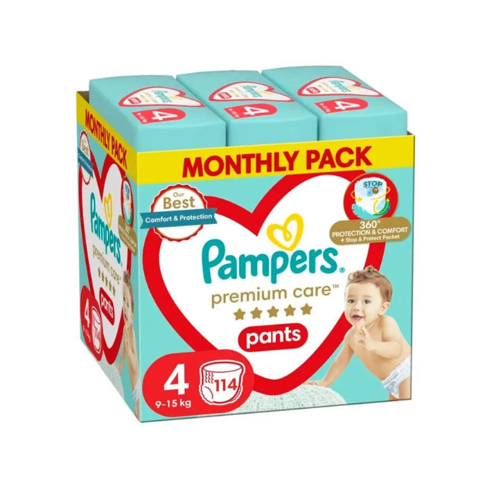 Подарете на Вашето бебе комфорт и защита от Pampers с гащичките Pampers Premium Care Pants! Сега с революционен джоб Stop & Protect, който помага за предотвратяване на протичанията откъм гърба, за пълна защита от протичане до 12 часа. Тъй като Вашето бебе става по-активно, ще имате нужда от пелена, която осигурява удобно прилягане и сигурна защита, така че бебето да може да се справи с всяко движение. Ето защо гащичките Pampers Premium Care Pants предлагат оптимални комфорт и защита, с удобно прилягане навсякъде благодарение на ултра меките и еластични материали, които се адаптират към тялото на бебето. Както всички гащички, Pampers Premium Care Pants се сменят лесно: просто издърпайте внимателно, отстранете, като разкъсате страните, навийте на руло и залепете за лесно съхранение, дори когато бебето се движи енергично. Точно като Вас, Pampers поставя безопасността на Вашето бебе преди всичко: Гащичките Pampers Premium Care Pants са дерматологично тествани и съдържат 0% ароматни алергени на ЕС (съгласно разпоредбите на Регламент на ЕС № 1223/2009 относно козметичните продукти). Одобрени са от дерматолози от Алианса за здраве на кожата като безопасни за бебешката кожа.