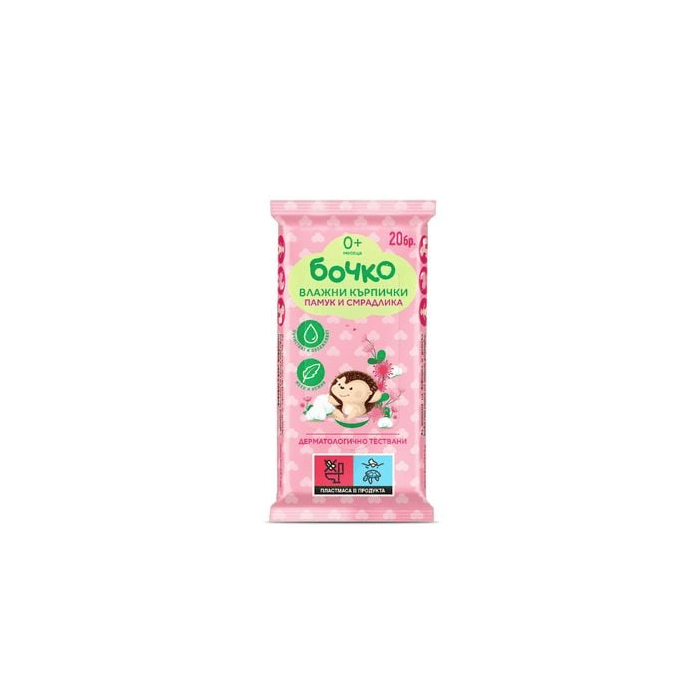 Бочко влажни кърпичи с памук и смрадлика, овлажняват и почистват нежната кожа на вашето бебе. Подходчщи са за употреба от раждането, с балансирано pH и не съдържат спирт.