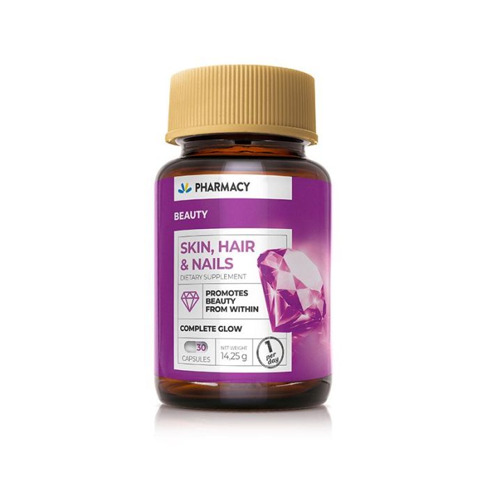 Pharmacy Skin, Hair & Nails Кожа, коса и нокти, капсули е хранителна добавка с аминокиселини, мед, селен, витамини от група В и витамин С, предназначена за кожа, коса и нокти. Витамин В7 и селен допринасят за поддържането на нормалното състояние на косата. Витамините В2, В3 и В7 допринасят за за поддържането на нормалното състояние на кожата. Медта допринася за нормалната пигментация на косата и кожата. Селенът опринася за поддържането на нормалното състояние на ноктите. Витамин С допринася за нормалното образуване на колаген за нормалната функция на кожата. Витамин В6 допринася за нормалния синтез на цистеин и за регулирането на хормоналната дейност. Витамините В2, С, мед и селен допринасят за защитата на клетките от оксидативен стрес.