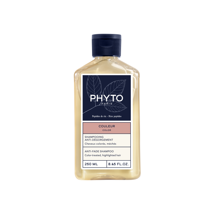 Phyto Color Anti-Fade Shampoo e шампоан за боядисана коса, който нежно почиства скалпа и косата и "заключва" цветните пигменти в косъма. Подходящ за боядисана коса и коса на кичури. Формулата съдържа 90% съставки с естествен произход, сред които: органичен екстракт от лечебна бяла ружа – доказано придава двойно повече блясък на косъмните влакна; комплекс от оризови пептиди – защитава цвета като не позволява избледняване на цветните пигменти; екстракт от храст Тара и слънчогледови кълнове – предпазват цвета от свободни радикали; масло от Каранджа – възстановява и удължава блясъка и яркостта на цвета.