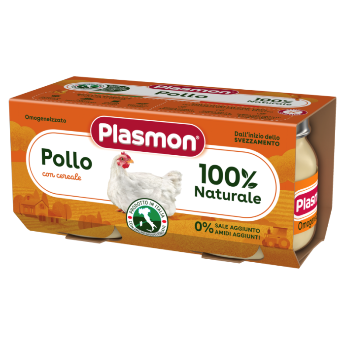 Plasmon пилешко пюре е храна за кърмачета, хомогенизирано пилешко месо и зърнени храни, подходящ за бебета от 6 месеца, освен ако педиатърът не препоръча друго.
