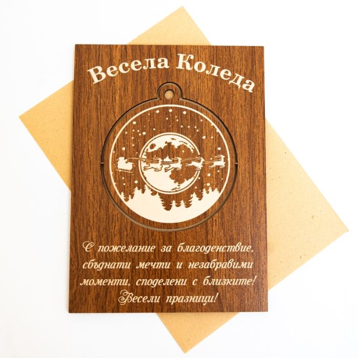 Поздравителна картичка от дърво ''Весела Коледа '' с играчка за елха, 1бр