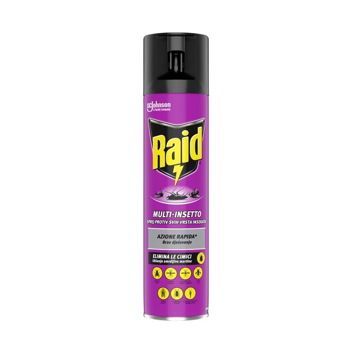 Raid® аерозол – Универсал е създаден, за да осигури ефективна защита срещу летящи и пълзящи насекоми, които може да откриете във вашата къща. Raid® аерозол – Универсал е продукт, който ще осигури цялостна защита от насекоми в дома ви. Raid® аерозол – Универсал е за борба с летящи (мухи, комари, тигрови комари, оси, молци, стършели) и пълзящи (хлебарки, бълхи, дървеници, мравки) насекоми и други артроподи (бръмбари, щипалки, мокрици, щурци, Lepisma saccharina, некръвосмучещи дървеници) в бита и обекти с общесствено предназначение.