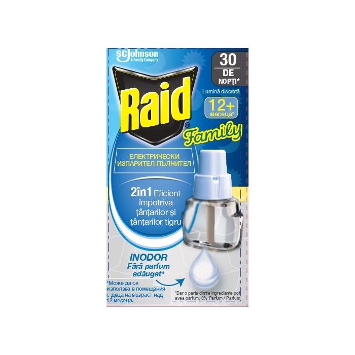 Ефективен срещу обикновени и тигрови комари. RAID Liquid Electric Family ви осигурява защита, на която можете да се доверите срещу досадни комари за добър нощен сън. Дифузорът е специално проектиран с мисълта за вашето дете и създава непрекъсната зона на защита срещу комари там, където имате най-голяма нужда от нея.