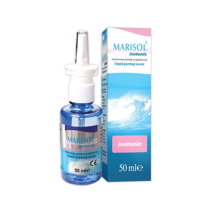 Спрей разтвор за нос, предназначен за ежедневна хигиена на носа. Има овлажняваща и предпазваща лигавицата на носа функция и действа бързо и ефективно, благодарение на съдържащия се в него разтвор на морска сол, обогатен с природни микроелементи. Марисол е отлично средство за профилактика при простудни заболявания, суха и раздразнена лигавица, кихане от алергичен произход, при хора с непроходими дихателните пътища, както и за поддържане на ежедневна носна хигиена. Марисол се препоръчва и като превантивно средство, в различни ситуации, когато има риск от изсушаване на лигавицата на дихателните пътища. Марисол е назален спрей с дозатор, в практична 50 мл опаковка.