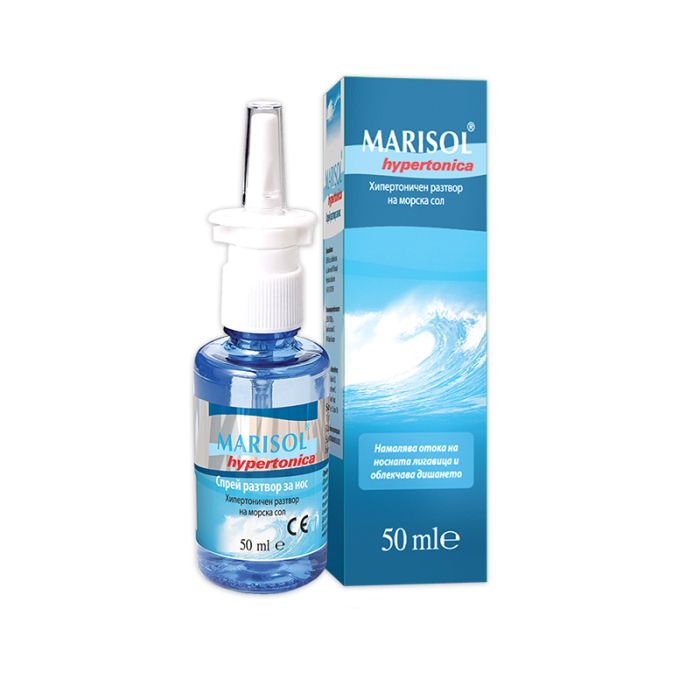 Спрей разтвор за нос, предназначен за ежедневна хигиена на носа, като има овлажняваща и предпазваща лигавицата на носа функция и действа бързо и ефективно, благодарение на съдържащия се в него разтвор на морска сол, обогатен с природни микроелементи. Тъй като разтворът е хипертоничен, в сравнение с физиологичните течности в организма на човека, той съдържа повече сол. След прилагане на разтвора, отокът на мукозата бързо намалява, посредством естествения механизъм осмоза. В следствие на това, дишането значително се улеснява, а носната лигавица остава хидратирана. Marisol Hypertonica е с уникално съдържание на морска сол, концентрацията на която съответства на солеността на морската вода, Марисол е отлично средство за профилактика при простудни заболявания, суха и раздразнена лигавица, кихане от алергичен произход, при хора с непроходими дихателните пътища, както и за поддържане на ежедневна носна хигиена. Marisol се препоръчва и като превантивно средство, в различни ситуации, когато има риск от изсушаване на лигавицата на дихателните пътища. Марисол е назален спрей с дозатор, в практична 50 мл опаковка.