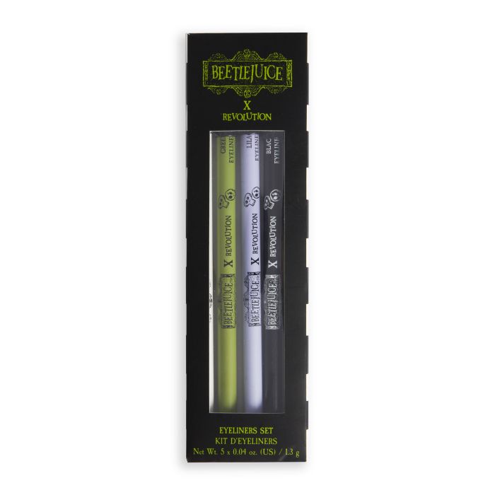 Комплект от 5 кремообразни молива за очи с всички нюанси, от които може да се нуждаете, за да създадете Beetlejuice™ облика на хилядолетието. Комплектът включва зелен, тъмно лилав, светло лилав, черен и бял молив.